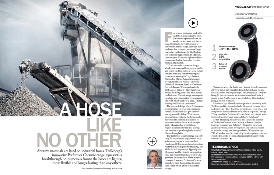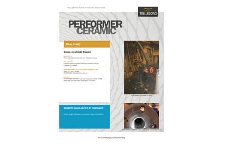 Ceramic tiles are embedded into the inner tube of the Performer Ceramic hose. The ceramic material has been selected for its excellent abrasion resistance and allows at least 10 times longer lifespan compared to a rubber hose.