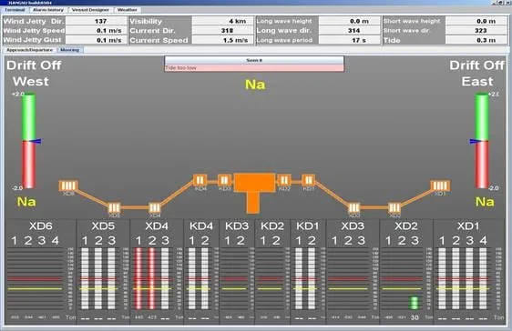 The calibrated load cell senses mooring line loads and transmits the data to the local controller and the monitoring software. The software graphics make it very easy for operators to see what the loads on each line are. Should the loads exceed the user-defined limits, alarms such as the light and siren are activated to warn operators that a particular mooring line needs attention. An LCD in the local controller also displays the load values.